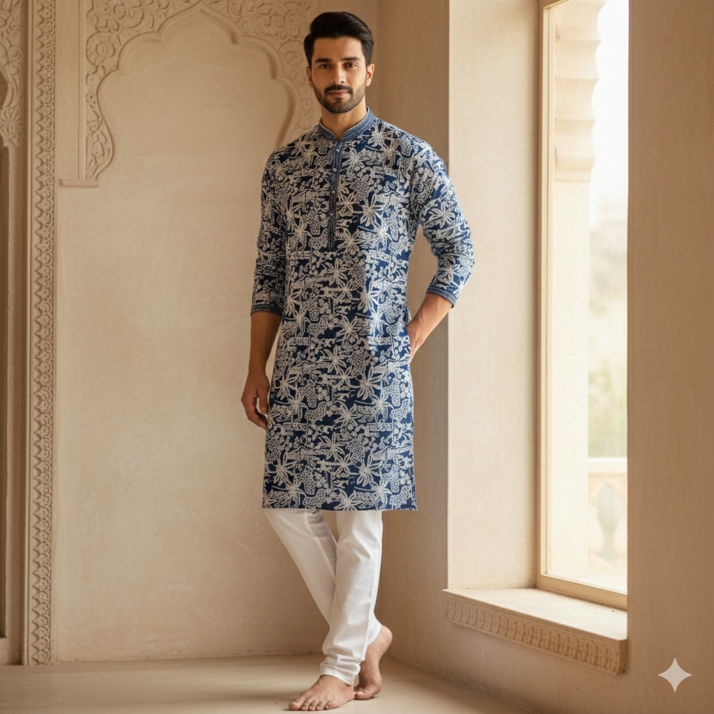 Step into effortless elegance with the Azure Heritage Kurta Set, a perfect blend of tradition and contemporary style. Designed in a rich blue tone, this kurta features intricate all-over floral and botanical prints that add a refined artistic charm.