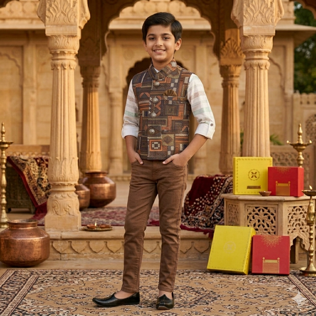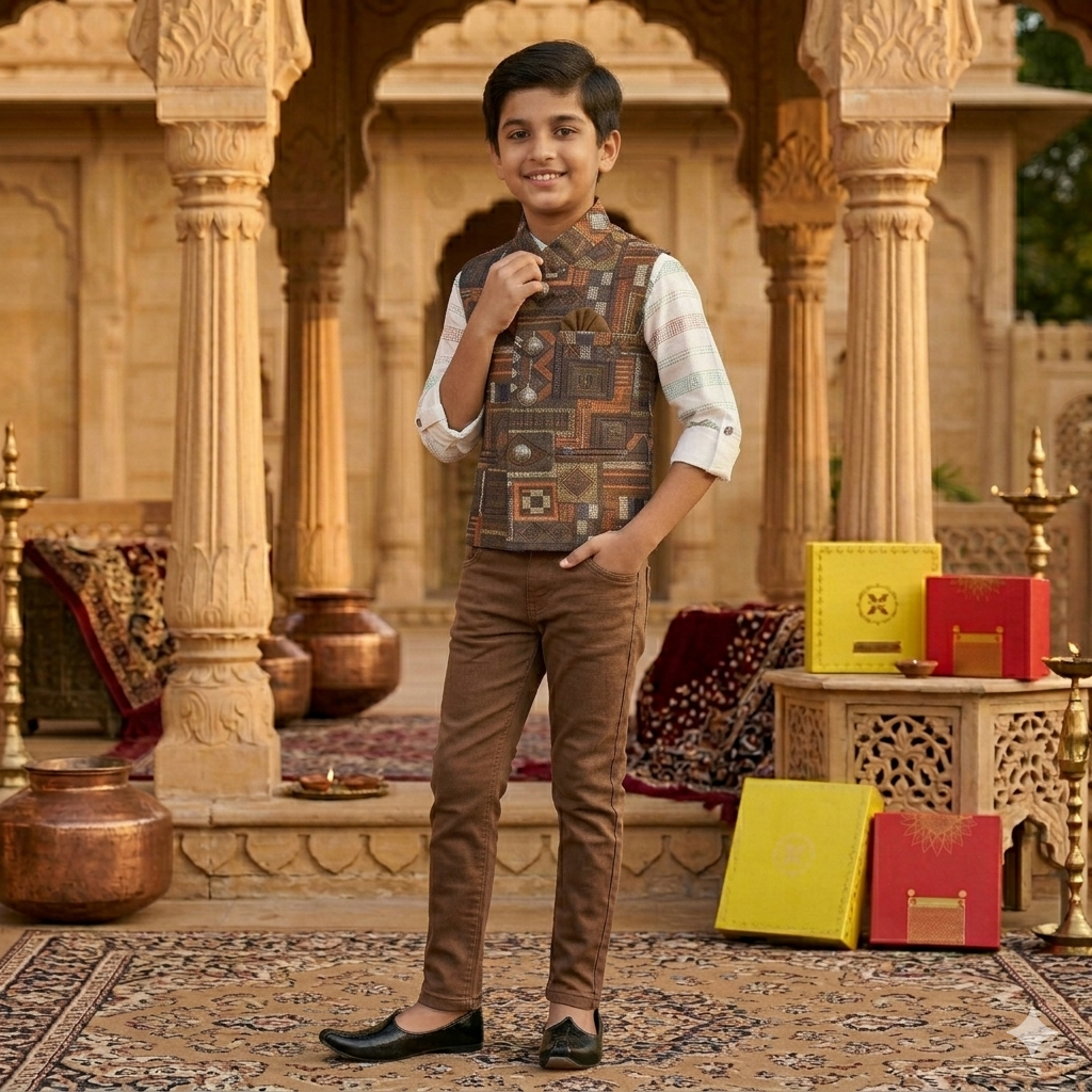 Paired with a smart shirt and trousers, this outfit delivers a perfect Indo-western fusion, suitable for weddings, festivals, and family gatherings.