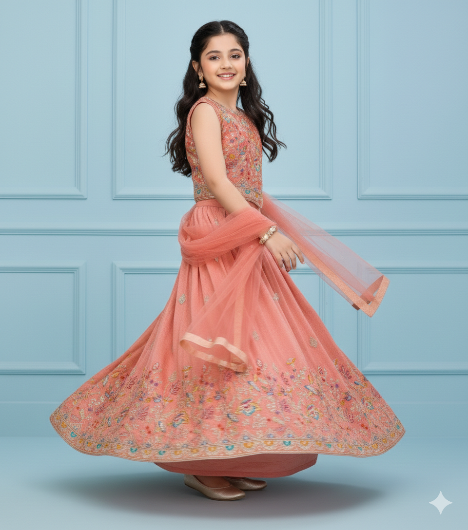 Add a soft and graceful charm to your child’s festive wardrobe with this elegant Peach Blossom Lehenga. Designed in a soothing peach hue, this ensemble features a beautifully embroidered blouse paired with a flowy lehenga and a delicate net dupatta, creating a dreamy and sophisticated look.
