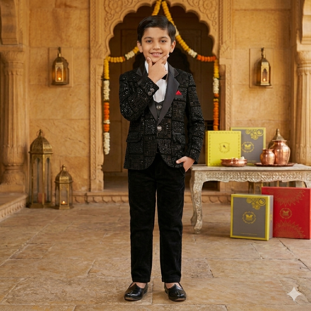 Make a striking statement with this sophisticated Royal Black Suit, designed to bring out confidence and charm in your child’s look. Crafted with premium textured fabric, this suit features a sleek black finish enhanced with subtle shimmer detailing, giving it a refined and luxurious appeal.