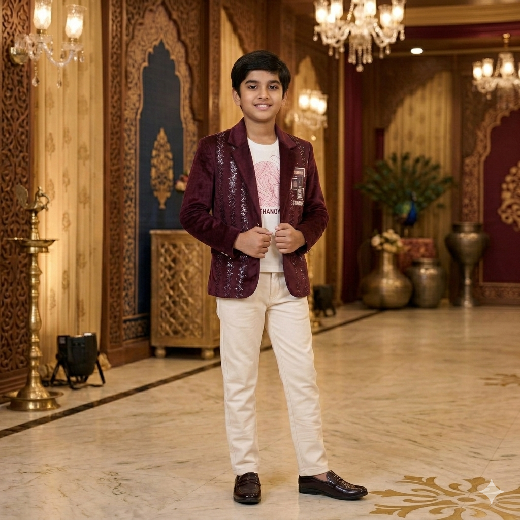 Elevate your child’s festive wardrobe with this elegant Royal Velvet Blazer, designed to blend traditional charm with modern sophistication. Crafted from premium velvet fabric, this blazer features a rich maroon tone enhanced with subtle shimmer detailing, making it perfect for weddings, celebrations, and special occasions.