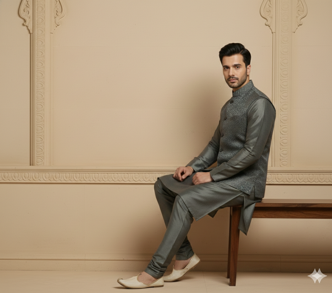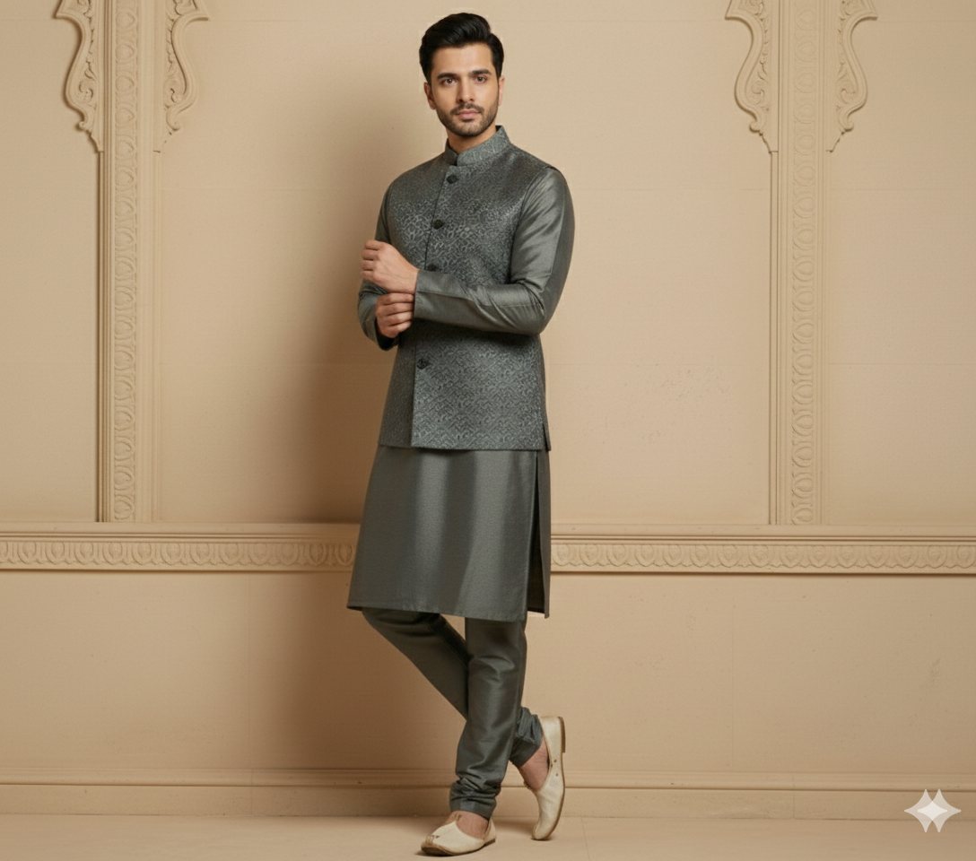Elevate your festive wardrobe with the refined sophistication of the Steel Elegance Kurta Jacket Set. Designed in a rich steel grey tone, this ensemble exudes modern royalty with its subtle sheen and intricate woven texture on the jacket.