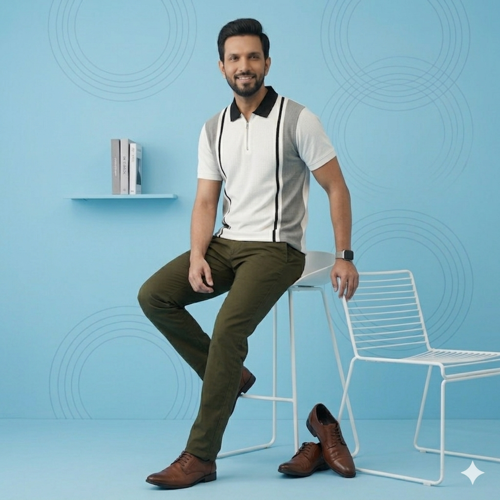 Pair it with olive or beige chinos and leather shoes for a sleek, semi-formal look.